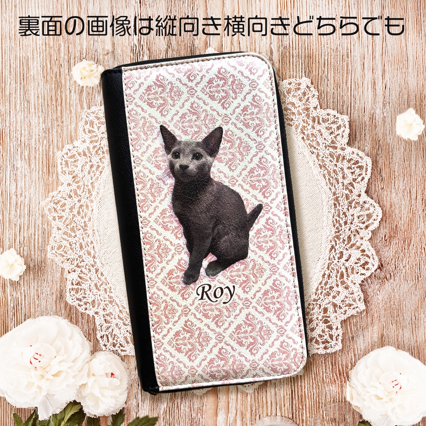 表、裏の両面印刷で、画像の入れ方は縦横どちらでも大丈夫です。財布としての機能性も高いのが特徴。